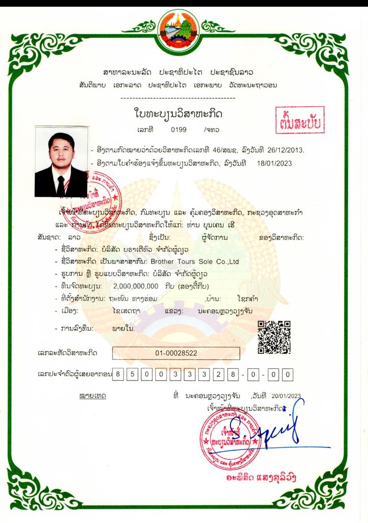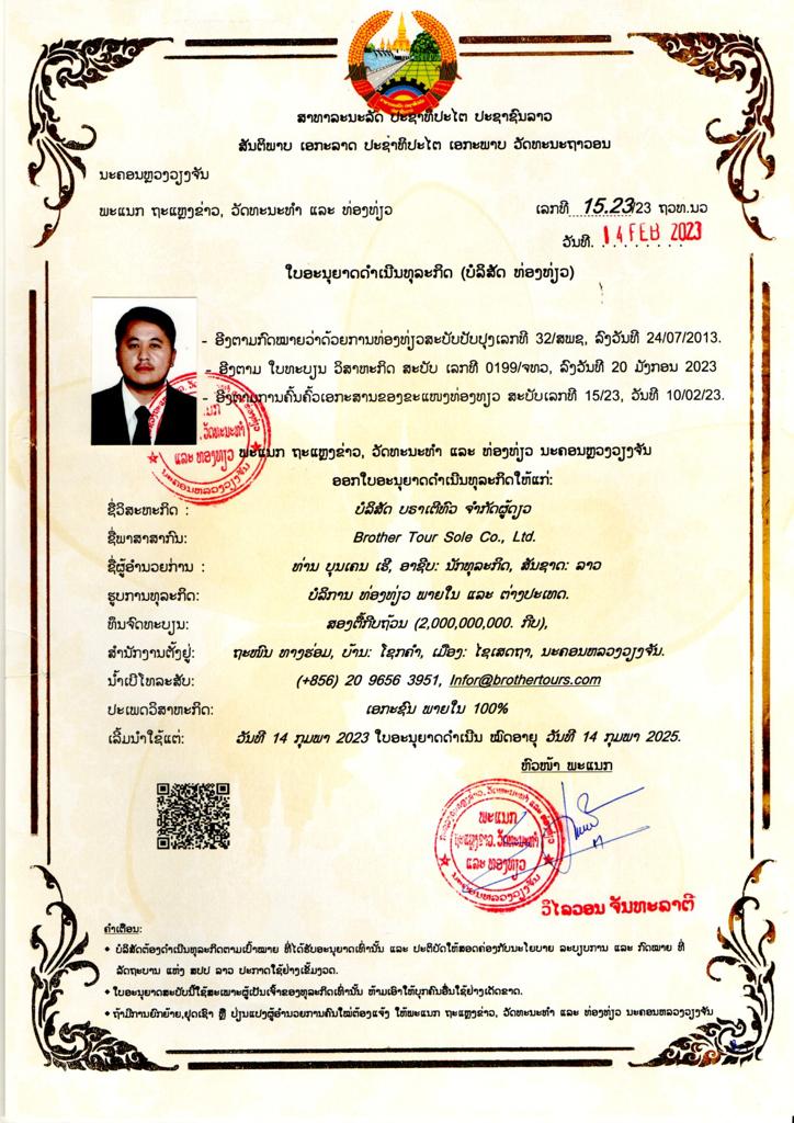 Brother Tours operates under full legal licensing, regulated by the Ministry of Information, Culture, and Tourism in Laos. As a fully licensed and compliant Domestic Travel Management Company, we hold all necessary certifications and permits required to ensure safety, quality, and professionalism in our operations.